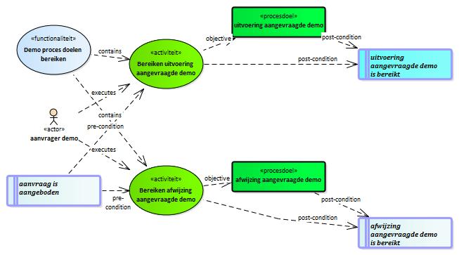 Demo proces doelen bereiken. Het proces is bedoeld om een aanvrager een demo te laten aanvragen. Wanneer de aanvraag aan de eisen voldoet wordt de demo uitgevoerd. Wanneer de aanvraag niet voldoet gebeurt dit niet. .