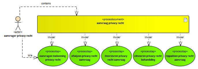 Het document waarmee een aanvrager het recht op een aanspraak vanwege het privacy recht heeft aanvraagd. Dit document wordt in meerdere stappen verwerkt. Aanvragen toekenning privacy recht starten. Oppakken privacy recht aanvraag voor het behandelen. Afwijzen privacy recht aanvraag als de aanvraag niet voldoet. Doorsturen privacy recht aanvraag als de gegevens van een andere organisatie zijn. |