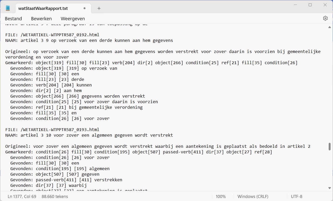 fragment rapport Wat Staat Waar. Gemarkeerde teksten die aangeven waar in de wet iets is gedefinieerd. De markering is aangebracht in de tekst van een artikel.