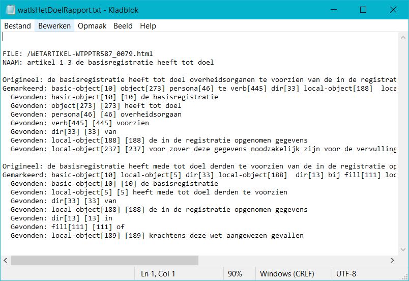 fragment rapport Wie Is Verantwoordelijk. Gemarkeerde teksten die aangeven of een actor verantwoordelijk voor de uitvoering. De markering is aangebracht in de tekst van een artikel.